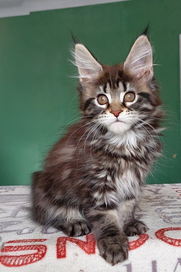 Hello, my name is Berenika, and I’m a Maine Coon girl with a bright personality and a charming, expressive look. My black marble coat features a beautiful, well defined pattern that highlights my elegant lines, and my large brown eyes are full of curiosity and warmth. I have a soft, feminine appearance paired with the strong structure typical of the Maine Coon breed.